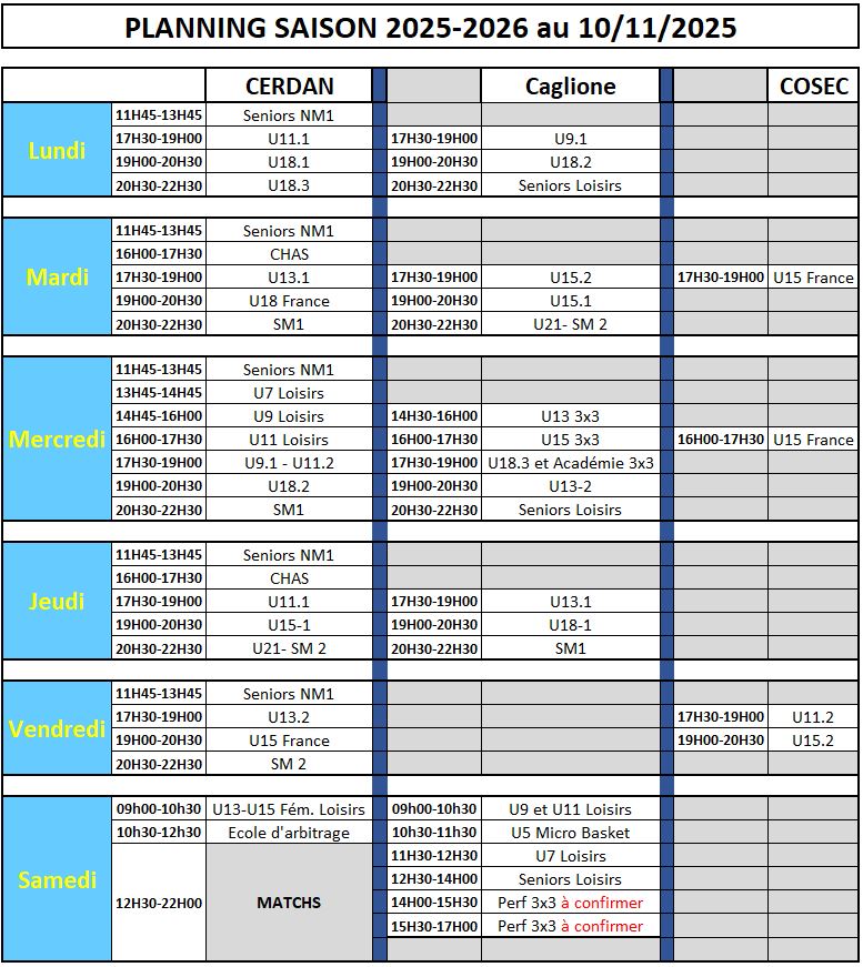 Le planning général des entraînements pour la saison. Il est susceptible de pouvoir être modifié jusqu’au 1/09/2025.